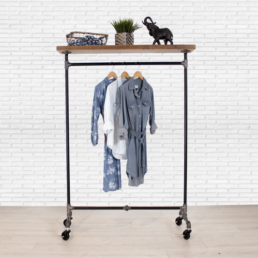 Industrial Pipe Clothing Rack with Solid Wood Shelves | Single Shelf on Wheels