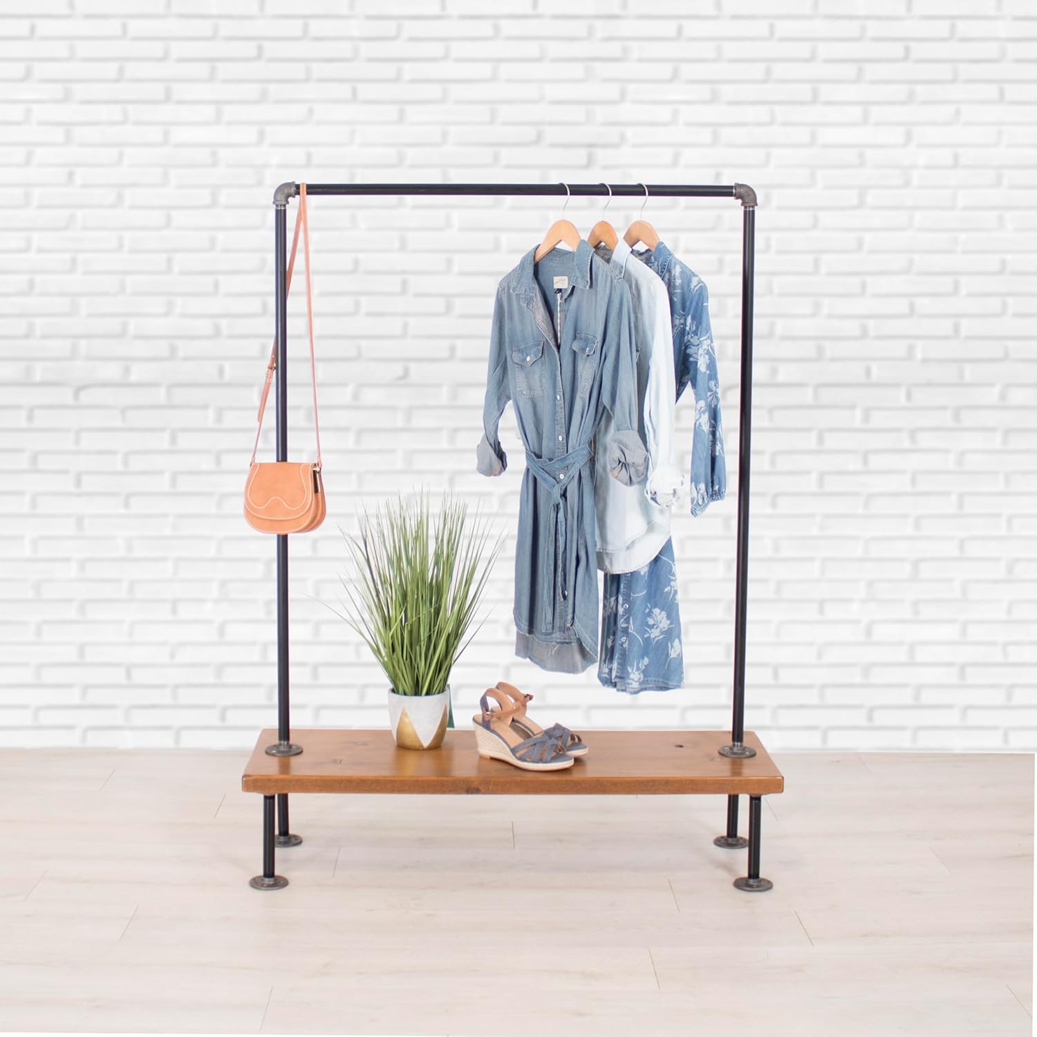 Industrial Pipe Clothing Rack with Wood Bottom Shelf